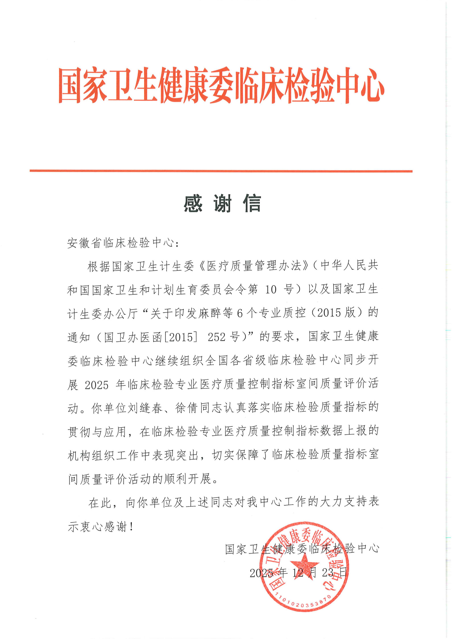 2025年安徽省临床检验中心获得国家临床检验质量指标工作感谢信