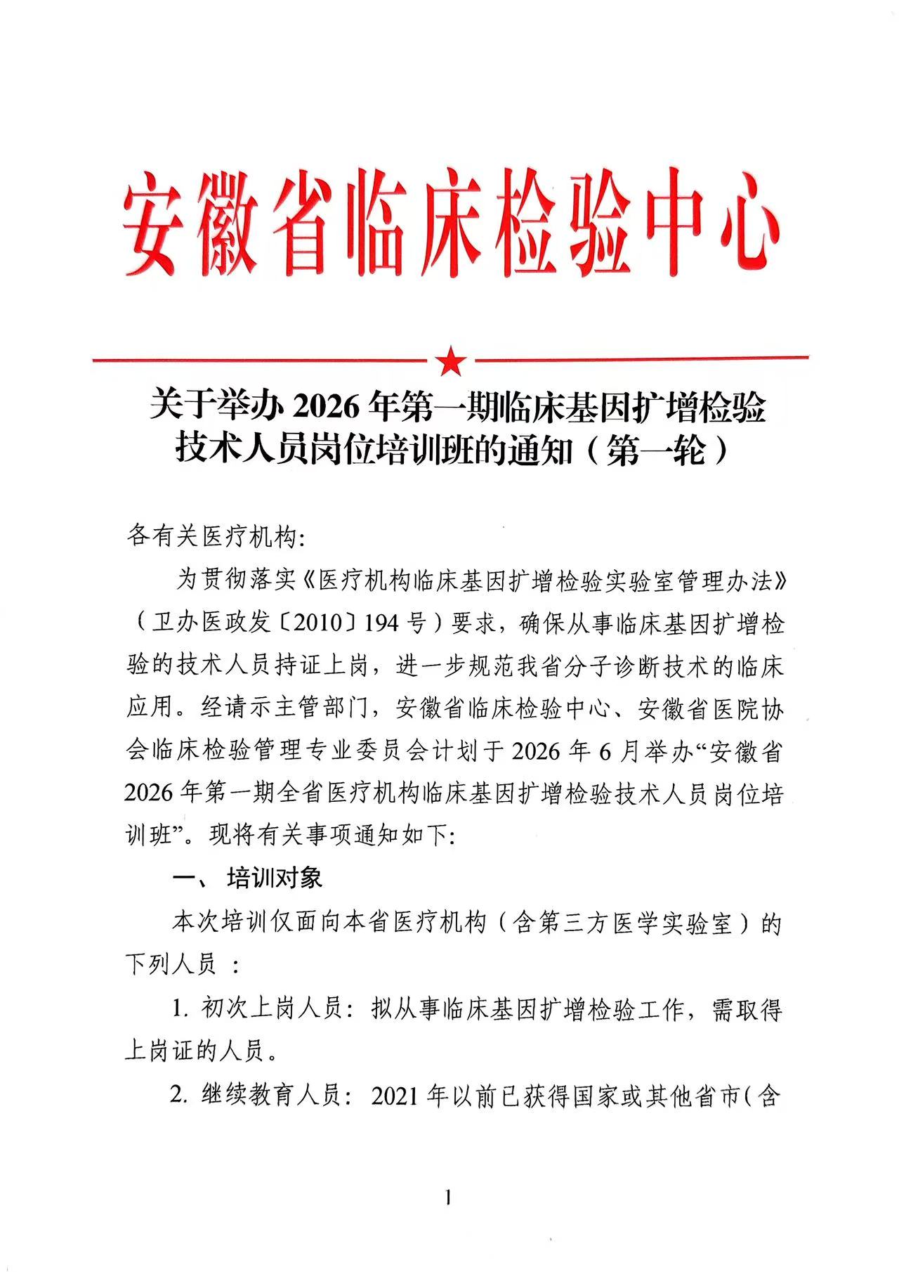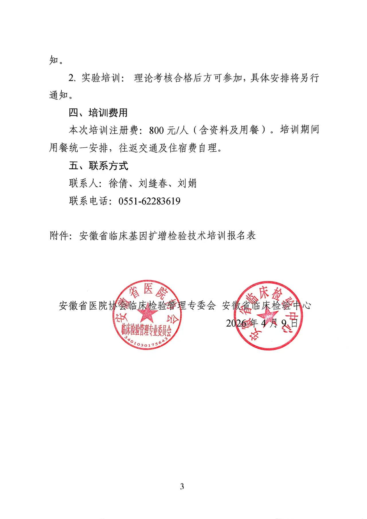 附件: 1.通知文件盖章版 2.安徽省临床基因扩增检验技术培训报名表